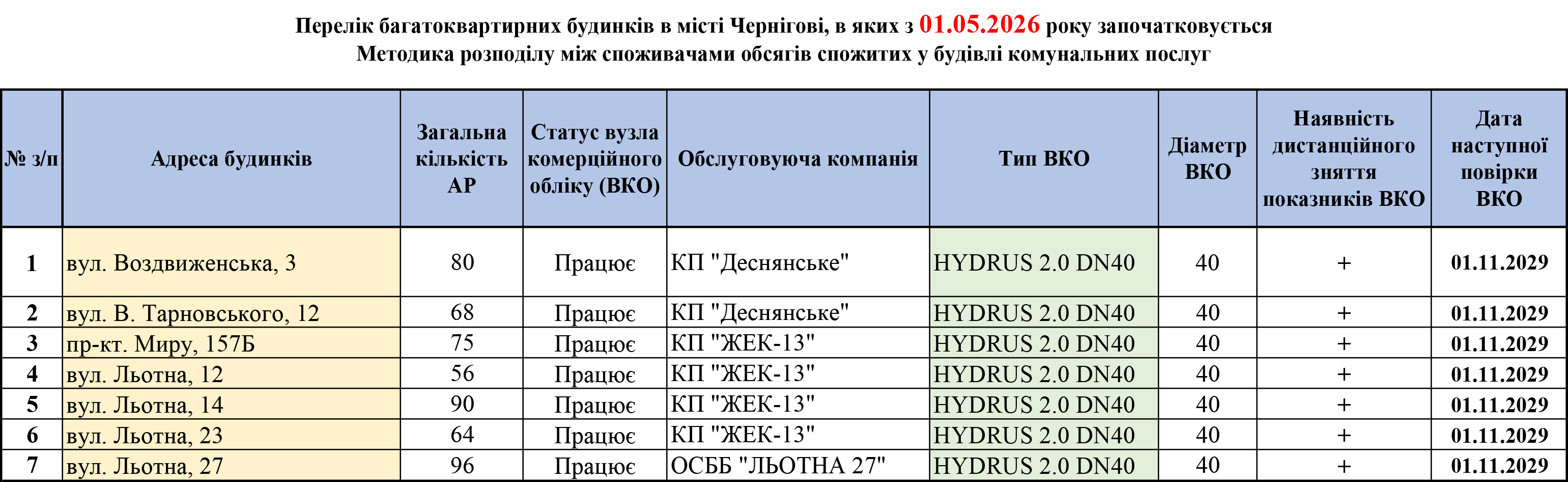 Починаючи з 01.05.2026 за приладами комерційного обліку води розраховуватимуть ще 7 житлових будинків міста Чернігова.