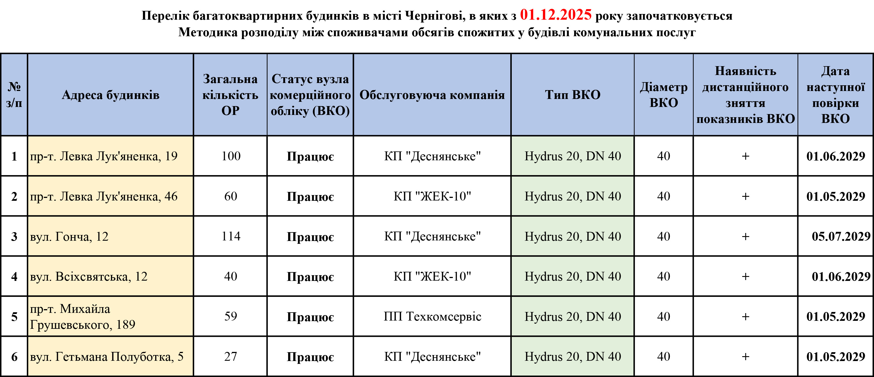 Починаючи з 01.12.2025 за приладами комерційного обліку води розраховуватимуть ще 6 житлових будинків міста Чернігова.