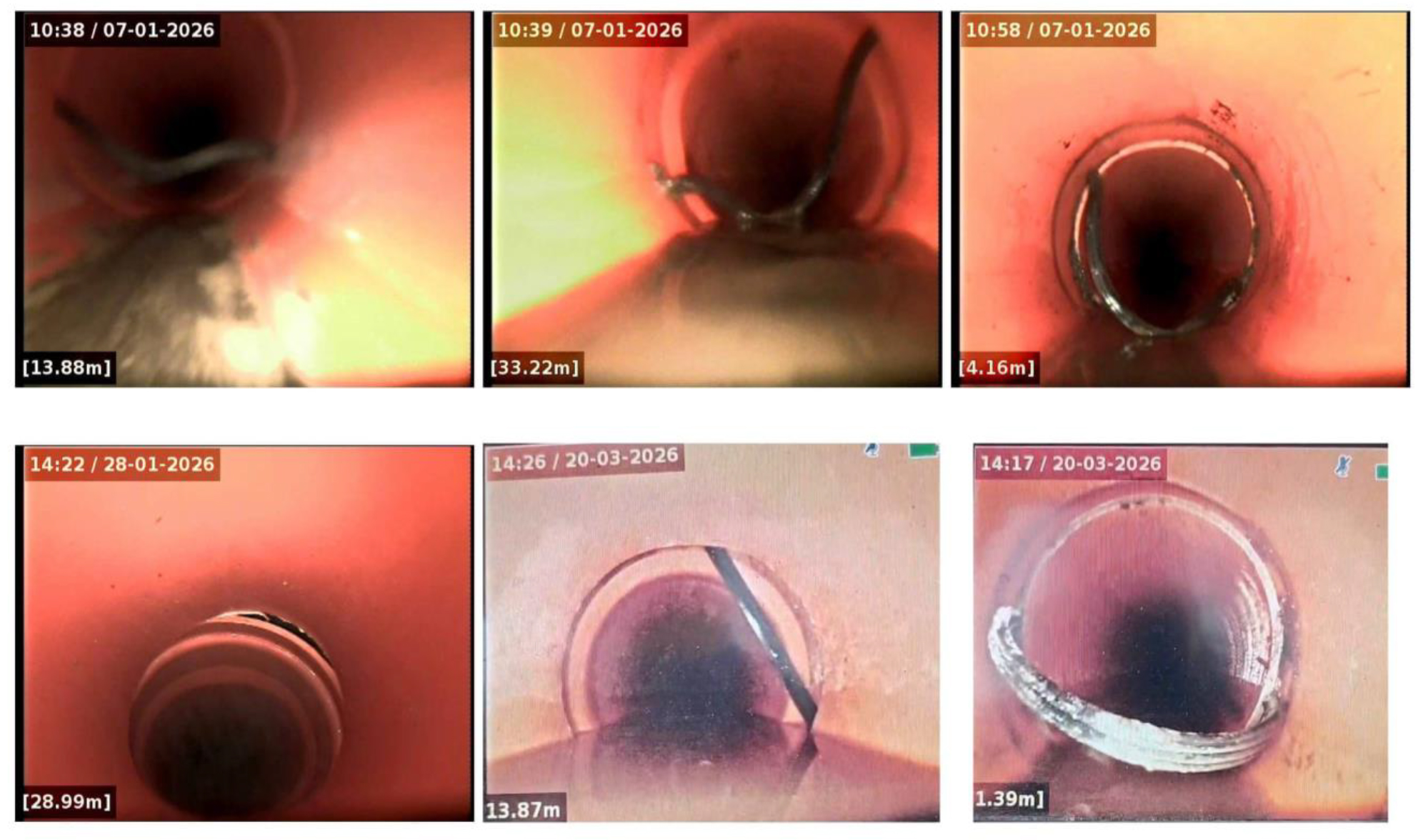 Що зробив підрядник: засипав траншею землею прямо з ковша екскаватора разом із залишками зруйнованого асфальту. На відеоінспекції зафіксовано наскрізний пролом у стінці труби — туди встромився великий шматок асфальту.
