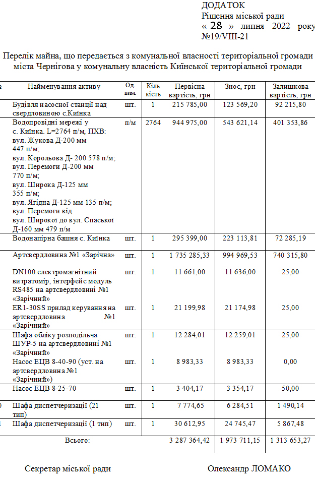 Киїнська територіальна громада виявила намірами створити власне комунальне підприємство з метою повноцінного відновлення працездатності водопровідної мережі (проведення відповідного ремонту) та організації належного водопостачання в с.Киїнка та с.Трисвятьська Слобода у зв’язку з чим просить розглянути можливість передачі з комунальної власності територіальної громади м.Чернігова до комунальної власності Киїнської територіальної громади будівлі насосної станції над свердловиною, водопровідної башні в с.Киїнка та водопровідних мереж, про що звернулись листом від 28.06.2022 за вих.№02-09/395 до міського голови.